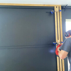 12mm Natural or Stained Oak Veneer Slats on 12mm Acoustic Felt. (600×2400/2700/3000mm)Numerous panels can easily be altered to custom heights and widths and fitted alongside each other to cover large wall surfaces. These modular panels can also be used on ceilings.